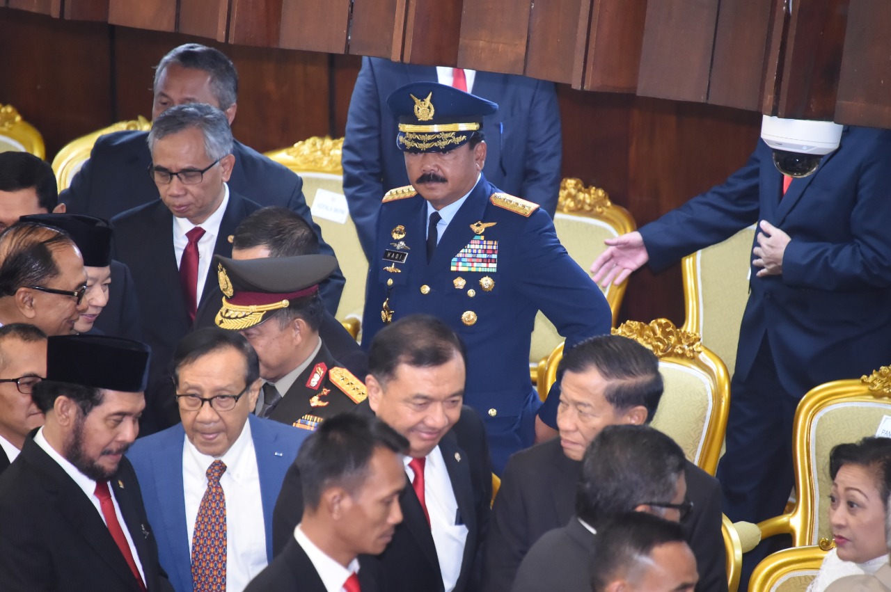 Panglima TNI Marsekal TNI Dr. (H.C.) Hadi Tjahjanto, S.I.P. dan Kapolri Jenderal Pol Prof. H.M. Tito Karnavian, Ph.D. menghadiri pelantikan anggota Dewan Perwakilan Rakyat (DPR), Dewan Perwakilan Daerah (DPD) dan Majelis Permusyawaratan Rakyat (MPR) Republik Indonesia periode 2019-2024 di Kompleks Parlemen, Senayan, Jakarta Pusat, Selasa (1/10/2019).
